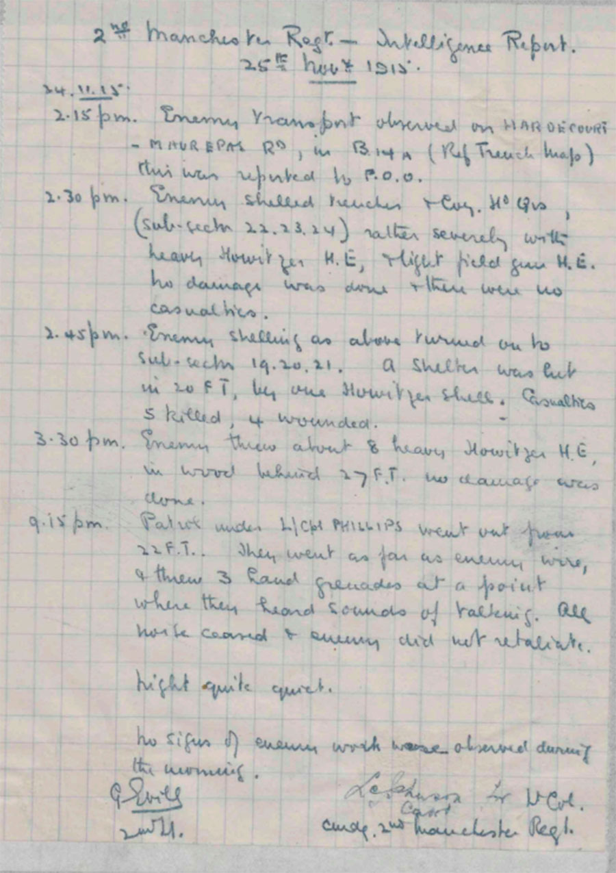 On the night of the 24/25th Lieut. E.A. Shacklady and a patrol reconnoitred the enemy lines and an old French trench which runs up to the German lines, nothing was seen, and no enemy encountered. Casualties in the trenches by shell fire, 6 men killed, 3 wounded and 6 men suffering from shock.