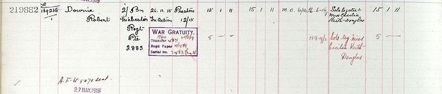Sergt. Morris (5th Cheshire’s), the verger at St. Mary’s-on-the-Hill (who is home on leave this week), told Miss Cecilia Keith Douglas that Downie was also a great favourite with his fellow soldiers. He often saw Sergt. Morris who was talking to him about ten days ago just before the Manchester’s returned to the trenches, where Downie met a soldier’s fate. He was shot through the heart, and his chum who wrote the sad news home, saw him buried next day. His father was in the Black Watch and fell in the Boer War. He came to the working boy’s home as a little boy and was one of the best young fellows ever turned out from the home.