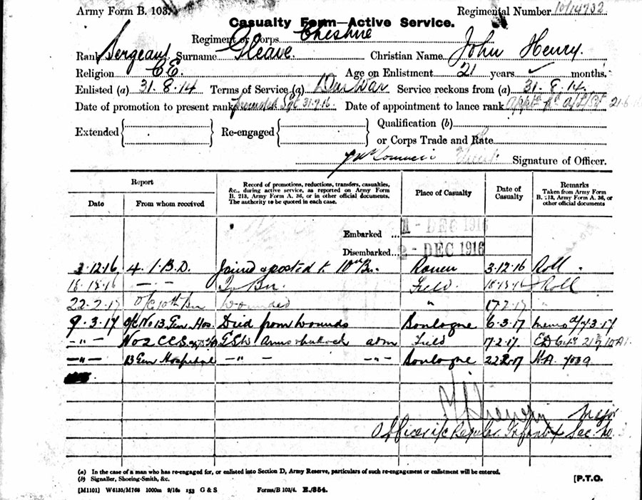 When war was declared 4th August 1914, John Henry was working as a labourer at Brunner Mond at Lostock Gralam, he enlisted 31st August 1914, his given age was 21, he was 5ft 7 ¾ inches with a fresh complexion, blue eyes and brown hair. On 15th September he was posted to the 10th battalion Cheshire Regiment. The 10th battalion were formed in Chester on 10th September 1914, they moved to Codford St. Mary and then in November moved to billets in Bournemouth, by May 1915 they were in Aldershot, by then John had been promoted to an unpaid Lance Corporal.