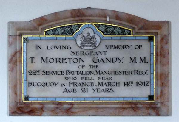 Weaverham St. Mary’s R.o.H. records two lads named Gandy, R.N. Gandy and a T.M. Gandy, T.M. Gandy is also remembered on the “Fallen” memorial as T.M. Gandy Sergt, MM. It appears he was known as Moreton.
