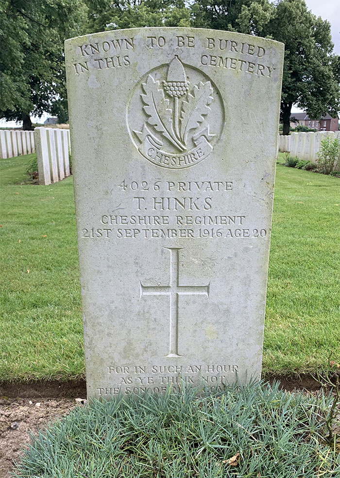 Private Thomas Hinks was the son of Mr. William Hinks of 5 Cross Street Marston. Prior to the war Thomas worked as an apprentice cabinet maker in the employ of Mr. J. Southern, Manchester House, Castle Street, he was prominent in the United Methodist Church in Wincham where he was a member of the Bible Class. He was also a keen athlete and played football for Marbury United. Thomas enlisted in October 1915 and went to France in February 1916.