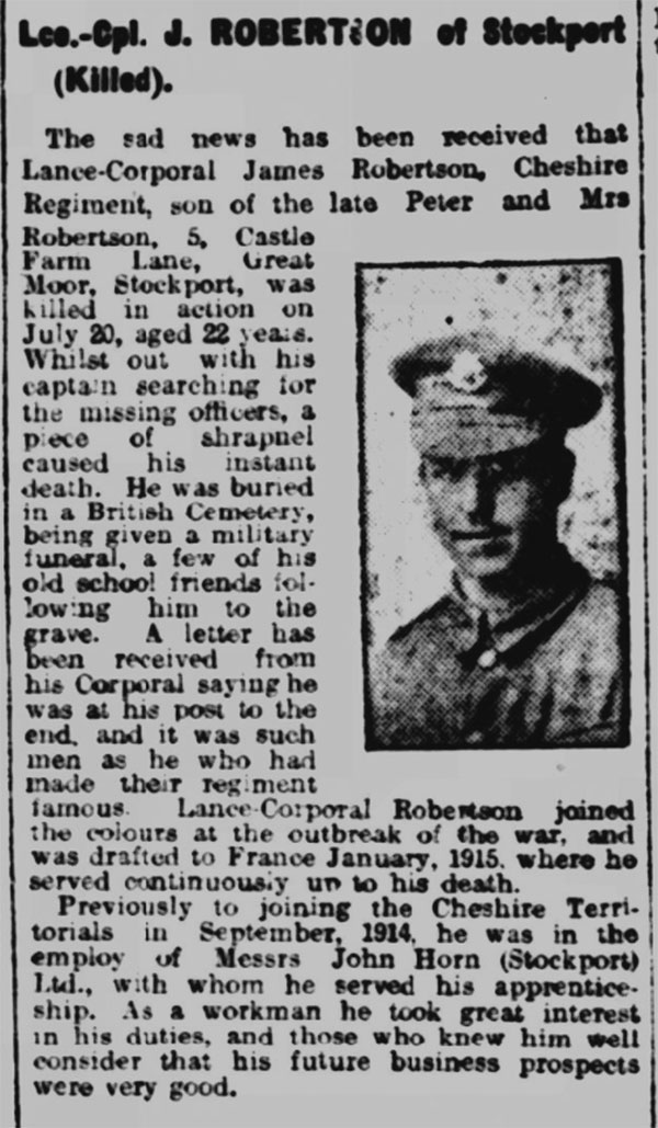 Jimmie was born in Stockport. His parents, Peter & Frances, lived at 5 Castle Farm Lane, Great Moor although, by the time the War Graves Commission was collating casualty information in the early 1920s, Peter had died. The family attended St Saviours' Church on Store Street. Jimmie served an apprenticeship with John Horn Ltd and enlisted in the army in September 1914. He went overseas in the following January. On 19 July, the Battalion was in front line trenches at Givenchy-les-la-Bassee, to the east of the French town of Bethune. In conjunction with units on either side, they took part in a large raid on the enemy's positions at Red Dragon Crater. The raid was a success but not all the Cheshires returned safely. It was reported that, the next day, James and others were in No Man's Land searching for the wounded, when he was hit by shrapnel killing him outright.