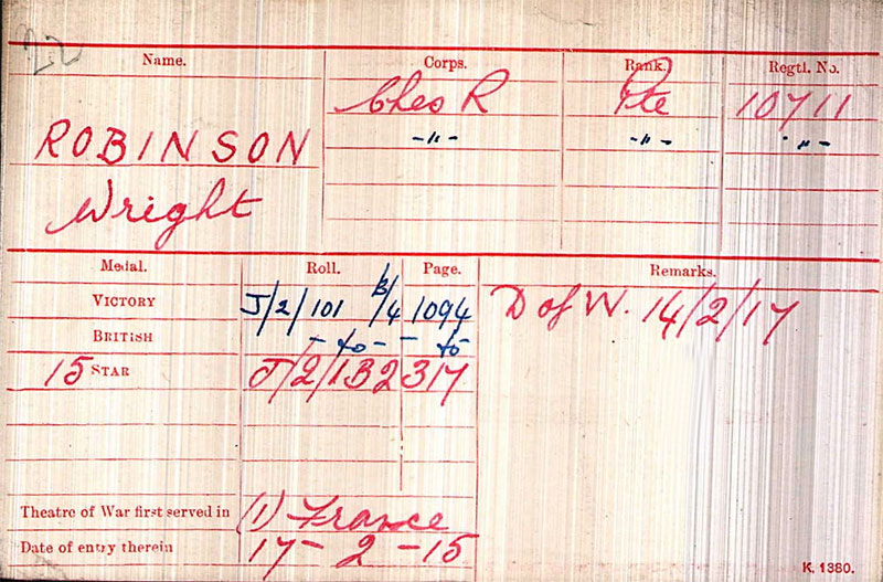 Wright's Medal Index Card shows that he had served overseas for nearly two years.