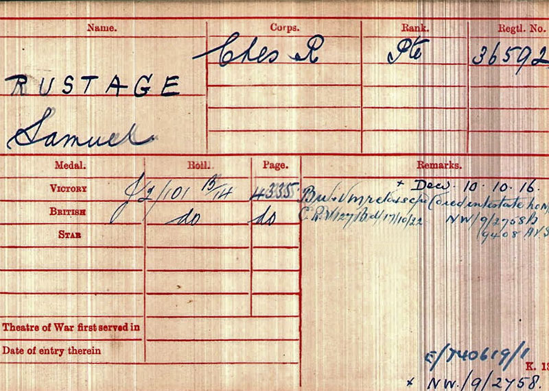 Samuel was killed on 10th October 1916; he was 36 years old. All efforts to trace his next of kin by the Army failed. His cousin Joseph Rustage is also commemorated on the Thiepval Memorial.