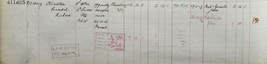 Randall attested into the Cheshire Yeomanry on January 29th 1915 his given age was 28 years 7 months, height 5ft 9 inches he was now married his next of kin is listed as, wife Jane Stockton 29, Hoofield, Tarvin. He would stay in the UK until the 20th September 1916, he embarked for France from Southampton and arrived at the territorial base depot in Rouen the following day, on the 29th September he was compulsorily transferred to the 8th battalion South Lancashire regiment, joining them on the 3rd October.