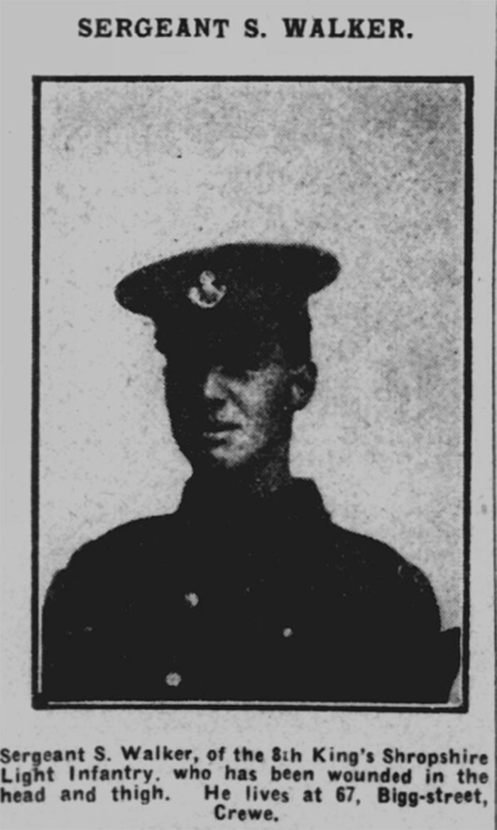 Samuel was born in Crewe and enlisted in Chester, he was the son of Samuel and Annie Walker of 67, Rigg Street, Crewe. Samuel before enlisting was employed as a timekeeper at Crewe Works.