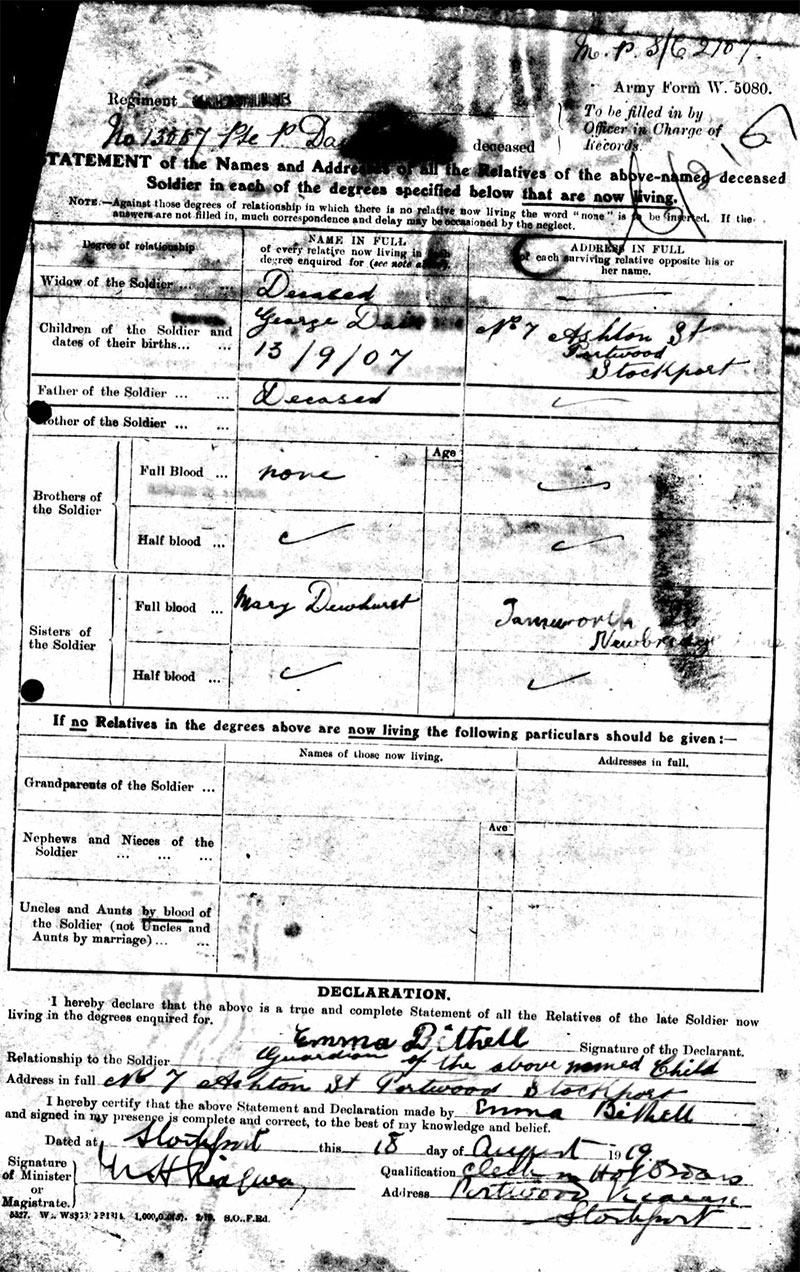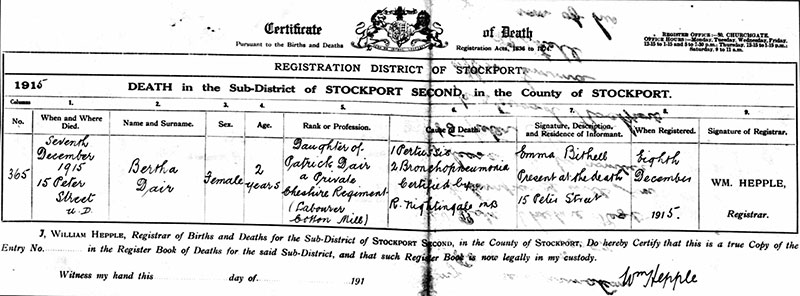 Patrick was born in Rochdale but, by the time of the 1901 Census, the family had moved to Stockport. However, Patrick does not appear to be listed on the Census although a John Dair, aged 31 and Mary Dair, aged 20 are shown living in the town. They were possibly his brother and sister. December 12, 1902, Patrick married Catherine Ditchfield. They lived, with their two children, at Barr's Court, Fountain Street, in the Portwood area of town. Patrick worked locally at the Portwood Spinning Company. The 1911 census shows the family living at 18 Heald Street, Portwood with two of Catherine’s brothers, the census also shows that Patrick and Catherine had four children Elizabeth 10, Patrick 7, George 3, and Kathleen 1, a fourth child Bertha was born in January 1913, sadly she died age 2, December 7, 1915, a couple of months after Patrick had left for France.
