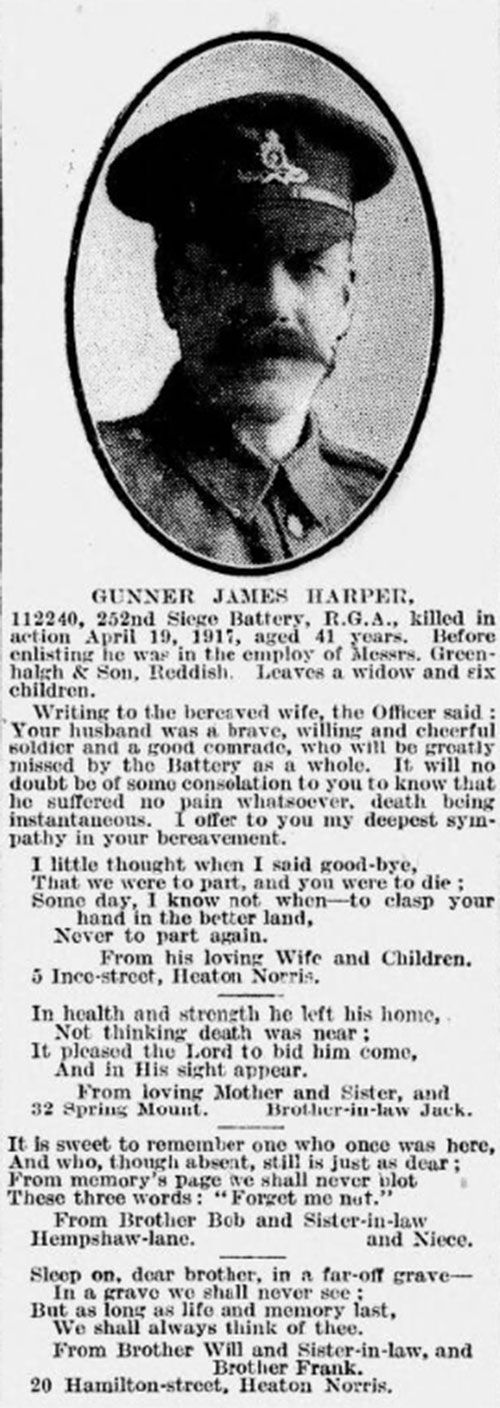 James was born in Shaw, Oldham, the son of Joseph and Mary Ann, but had lived in Heaton Norris for many years. On 17 April 1897, he married Emma Laurence at Christ Church. Their marriage certificate shows he was then working as a dyer (probably cotton). It also notes his father, by then deceased, had worked as a carter. Emma, then aged 20, lived at nearby 12 Hope Street. Her father, John, was a miner. She was unable to write and made her mark on the certificate. By the time of the War, the couple were living at 5 Ince Street and now had six children. James had changed jobs and was working for John Greenhalgh Ltd, a jam and preserves manufacturer with premises on Hurst Street, Reddish. The Siege Batteries of the Artillery fired the heaviest guns in the arsenal of the British Army, and were used to batter enemy strongpoints. Unfortunately, few records now remain of their day-to-day activities so it is not possible to know under what circumstances James was killed in action, but his officer wrote to the family saying “He was a brave, willing and cheerful soldier and a good comrade who will be greatly missed by the whole battery. It will no doubt be some consolation to you to known that he suffered no pain, death being instantaneous.” The fact that the Battery will have been a considerable way behind the front line almost certainly suggests that James was killed by the explosion of German shell which had been targeted on the Battery position.