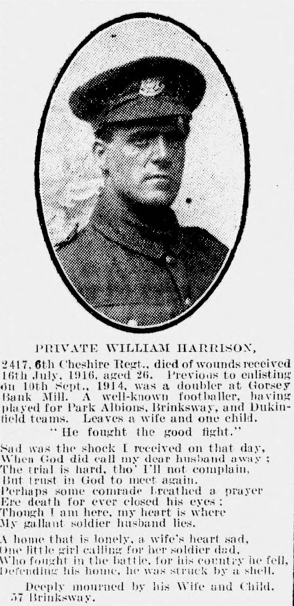 William was born within the parish of St Augustine's C of E Church, Brinksway, Stockport. The family home was at 4 Chester Street, Chestergate and, at the time of his death, his parents, 2 brothers (Joe and Jack) and 3 sisters (Bertha, Ethel and Lily) were living there. Joe was also serving with the army. William had married Annie Platt between January and March 1910, and they lived at 57 Brinksway with their child. He worked nearby, as a doubler, at Gorsey Bank Mill (and is commemorated on the company's entry in the Manchester Battalions Roll of Honour, page 497). He enlisted on 10 September 1914 into the 2/6th Battalion (reserves William was severely wounded during a period of duty in the front line. Later Annie's brother wrote saying that William had been buried by an explosion of a shell. He was unconscious when they had dug him out, but he died almost immediately. It is probable that Annie was being spared the true details of William's death. He is buried some miles away from where he was wounded at a cemetery adjacent to where 33rd Casualty Clearing Station was based. The Stations were the first significant part of the medical provision, and he would have only been brought there if he was still alive and the Battalion medical officer thought there was a chance of saving him. It's reasonable to assume that William had a very painful death. By the early 1920s, Annie had remarried to a Mr Mulvaney and was living at 8 Carlile Street, Edgeley.