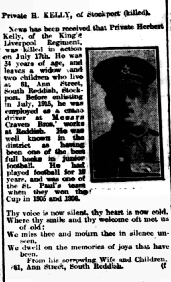Herbert's father had died by the time of the 1901 Census. He lived with his mother, Ann, and two older sisters, Sarah and Ada, at 76 Great Egerton Street, Stockport. At the time, he was working as a cotton doffer at a local mill. In 1907, Herbert married Elizabeth Dempsey in a civil ceremony at Stockport. They lived at 61 Ann Street, South Reddish and, over the years, had two children. By the time of the Great War, he had changed jobs and was employed by Craven Brothers of Reddish as a crane driver. The Company made cranes and machine tools. Herbert had always been a keen footballer and was still regarded as being one of the best fullbacks in the area. He had played for the St Paul's church team in 1905/6 when they had won the Stockport Cup. In July 1915, Herbert travelled into Manchester and enlisted into the army and will have gone overseas a few months later after training. After a period in reserve, the 13th King's took over front lines trenches on the 14 July 1917, near Demicourt (approximately 15 kilometres east of the French town of Peronne). This was a quiet time in the sector, but the Battalion maintained its offensive stance by undertaking patrols into No Man's Land during the hours of darkness. On the night of the 15/16th, a patrol came across an enemy outpost. The patrol rushed it but found no-one there. The tour of duty in the trenches ended during the night of 17/18 July. Although the Battalion's War Diary makes no mention of casualties, Herbert was one of three men to be killed during the day. Surprisingly, the three men are buried some nine kilometres away from Demicourt in a cemetery that was used by the Field Ambulance. It is possible that the men were wounded and evacuated from the frontline by the Field Ambulance, dying on route. However, they are recorded in Regimental records as having been "killed in action" as opposed to "died of wounds".