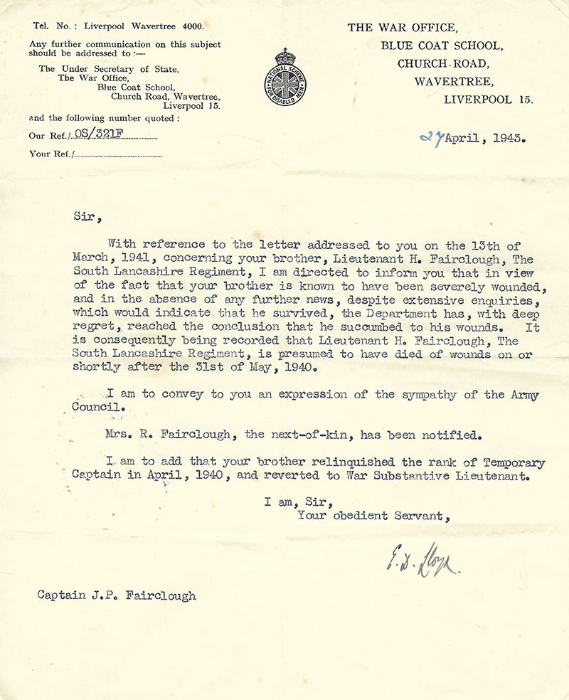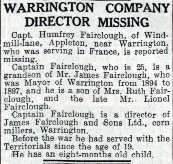 “Humfrey Fairclough like his elder brother Peter came from the Leas School Hoylake with a scholarship. He possessed rare intellectual gifts and before he was 16 had reached the Classical VIth. The Rev A.D. James, then his form master regarded him as one of the most brilliant boys he had ever taught. Humfrey’s contemporaries, however, will probably remember him for his invariable modesty and invincible cheerfulness as well as for his glorious sense of humour. Destined for a business career, he left school rather earlier than most and entered his uncle’s firm. Later he took a Territorial Commission in his county regiment, in which his brother and school friend Bill Barnish were already serving.” It concluded describing the retreat in which he was fatally injured.