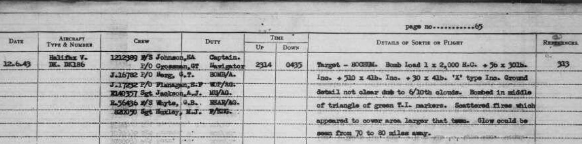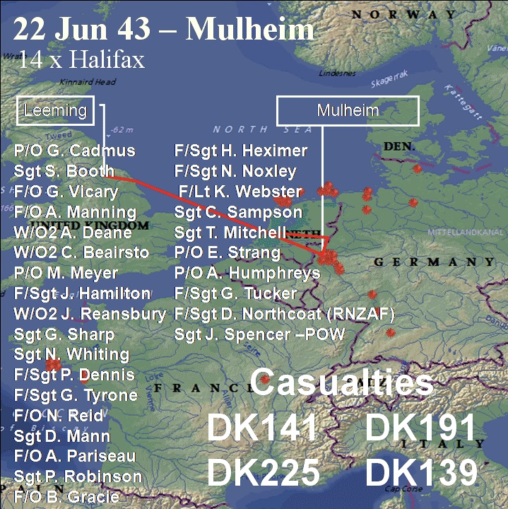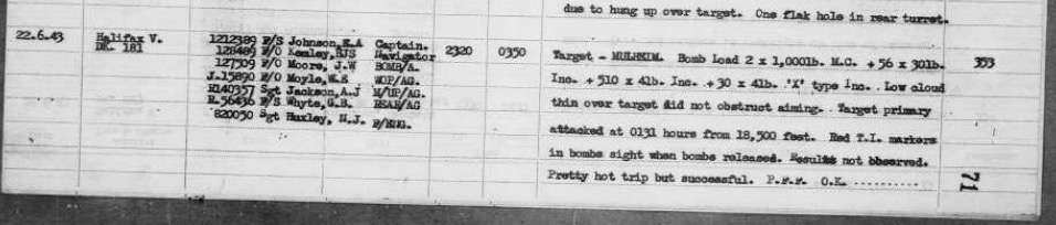 On the night of June 22-23, 1943, a large-scale RAF bombing raid on Mulheim, Germany, a key industrial center in the Ruhr Valley, took place. Approximately 557 bombers, including 155 Handley Page Halifaxes, participated in the operation. Norman flew in DK181 with Sgt EA Johnson on this mission.