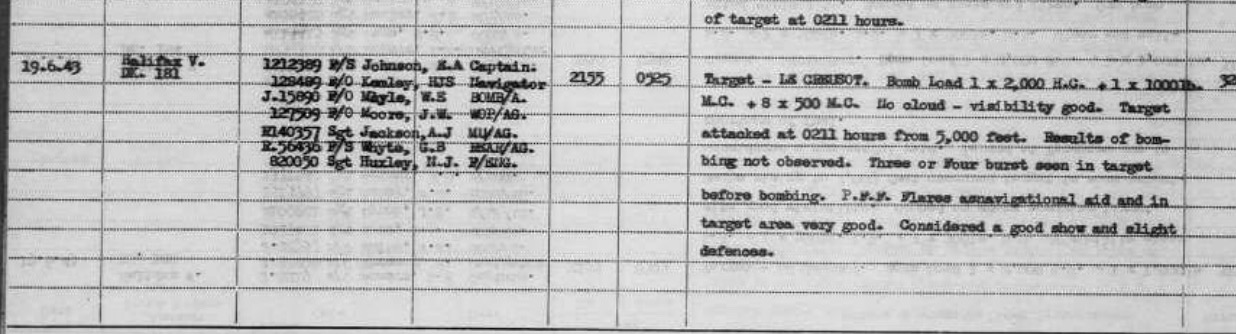 On the night of June 19-20, 1943, Bomber Command launched a large-scale air raid on Le Creusot, France, targeting the Schneider armaments factory and the Breuil steelworks. This raid involved 290 bombers, mostly Halifaxes and Stirlings, with a significant portion of the bombload hitting the Schneider plant. Norman flew in DK181 with Sgt EA Johnson on this mission. 2 Halifaxes were lost on this raid.