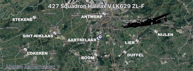 LK 629 failed to return from this mission and the crew were listed as missing. It was later determined that LK629 was shot down bu a German night fighter flown by Walter Schon of 1/NJG1 based at Arnhem and flying a Heinkel He219 night fighter. They were shot down on on the return flight from Germany. The plane crashed near the town of Aartselar south of Antwerp in Belgium with the loss of all 7 crew members. The crew were buried at Schoonselhof Cemetery at Antwerp.