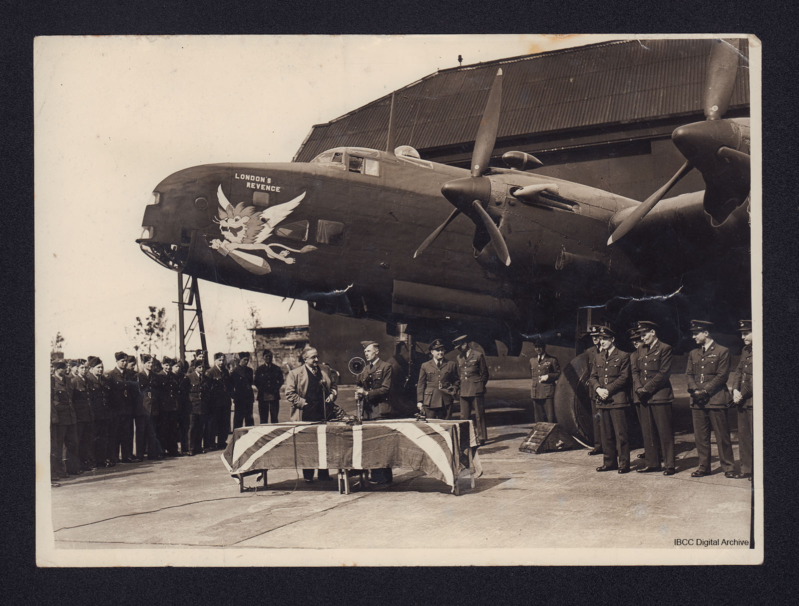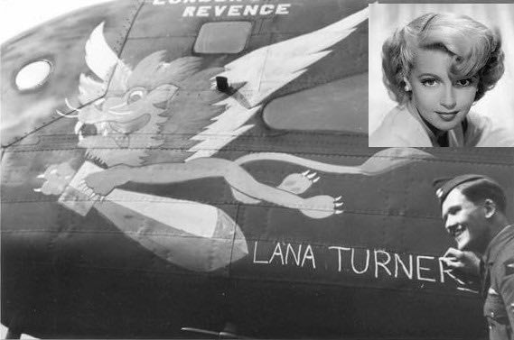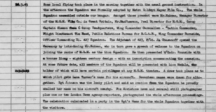 In May 1943, Metro-Goldwyn-Mayer Studios based in Hollywood, California offered to "adopt" the Royal Canadian Air Force's No. 427 Squadron that was flying Halifax Bombers. A special presentation was held on 24th May 1943 to formalize the relationship. Mr. Samuel Eckman Jr., managing director of M.G.M. (England), attended and the No. 427 commanding officer, Dudley Burnside, was present as well. Featured at the event was Halifax DK-186 (ZL-L). The bomber was painted with nose art featuring the M.G.M. lion (with wings) flying while holding a bomb between its paws. The bomber was named "London's Revenge". At the presentation a lottery was held to determine which crew could use the name of MGM star Lana Turner on their aircraft. Sgt Edward Arnold Johnson won the lottery and immediately wrote the star’s name on the nose of DK 186. EA Johnson was captain of Norman’s crew for 12 of his 13 missions and Norman flew in DK186 on 12th June 1943 on a mission to Hochum.