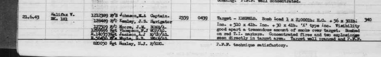 On the night of June 21/22, 1943, Krefeld, Germany, was bombed by the RAF. The raid, involving 705 aircraft, severely damaged and destroyed parts of the city, including a large area of the city center. The raid resulted in significant casualties and extensive damage to infrastructure and housing. 44 aircraft were lost.Norman flew in DK 192’with Sgt EA Johnson on this mission.