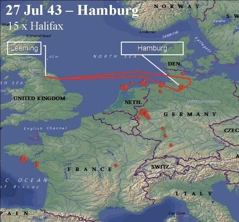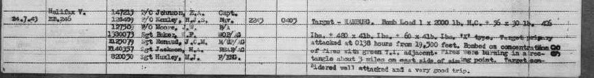 This mission was first mission in a 10 day campaign to attack Hamburg ordered by Arthur Harris under the code name “Operation Gommorah” On this night 791 bombers were deployed. German radar was rendered useless by the use of Window aluminum strips that were dropped from the bombers to reflect the radar signals. Norman flew in EB 246 with Sgt EA Johnson.