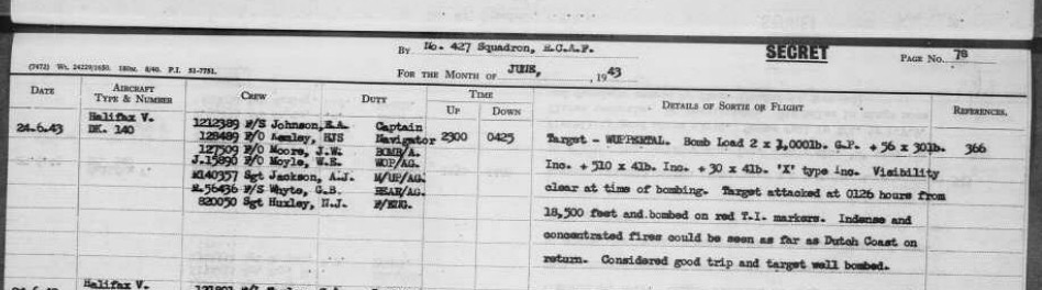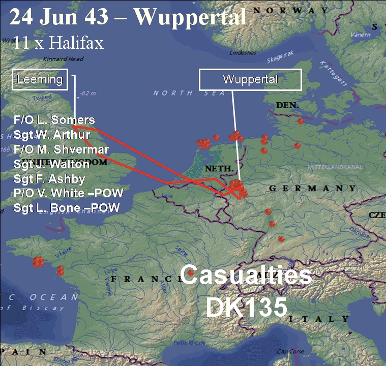 On the 24th June 1943 of 630 aircraft took part in an attack on Wuppertal. In the post-war bombing survey they were estimated to have destroyed 94% of the Elberfield target area - 3,000 houses and 53 industrial premises were destroyed. Almost the same number were seriously damaged. Around 1,800 people died. Norman flew in DK140 with Sgt EA Johnson on this mission.