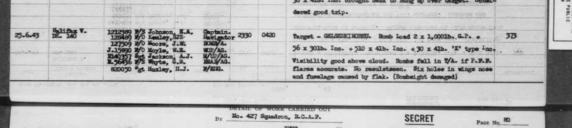 Norman Jones Huxley was the son of Richard and Nellie Huxley of Altrincham, Cheshire. He trained as a Flight Engineer and joined 427 (Lion) Squadron Royal Canadian Air Force (RCAF) when they reequipped with Halifax V aircraft requiring 7 crew having previously flown Wellington aircraft requiring 5 crew members. The squadron was based at RAF Leeming in North Yorkshire.427 Squadron