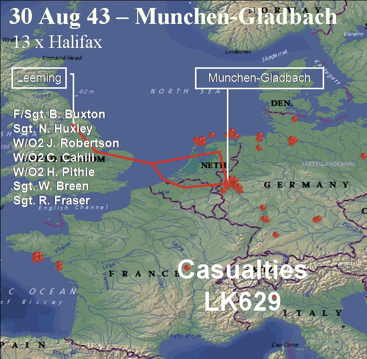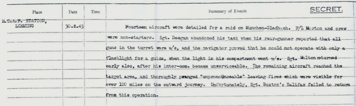 Norman flew in LK629 for this mission under Sgt Buxton as captain. Took off from RAF Leeming, Yorkshire at 23.58 hrs along with 14 others from the Squadron. Part of a 660 strong force to bomb Münchengladbach, (3) Germany.