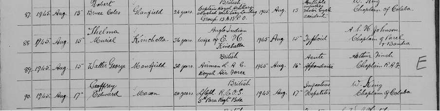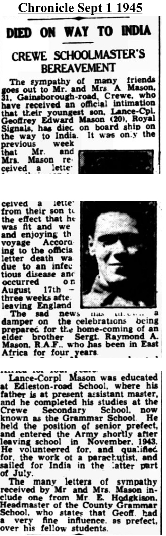 Geoffrey Edward Mason was the son of Mr and Mrs A Mason of Gainsborough Road Crewe. He studied at Crewe Secondary School from 1935 to 1943. He joined the army shortly after finishing school in November 1943 and volunteered for Airborne training which he successfully completed. In July 1945 he sailed for India where he was to join the Royal Corps of Signals attached to 5th Parachute Brigade. However, whilst on the ship he contracted infectious hepatitis and died on 17th August 1945 aged 20. He was buried in Kirkee War Cemetery, Pune after initial burial at Sewree Cemetery in Bombay.