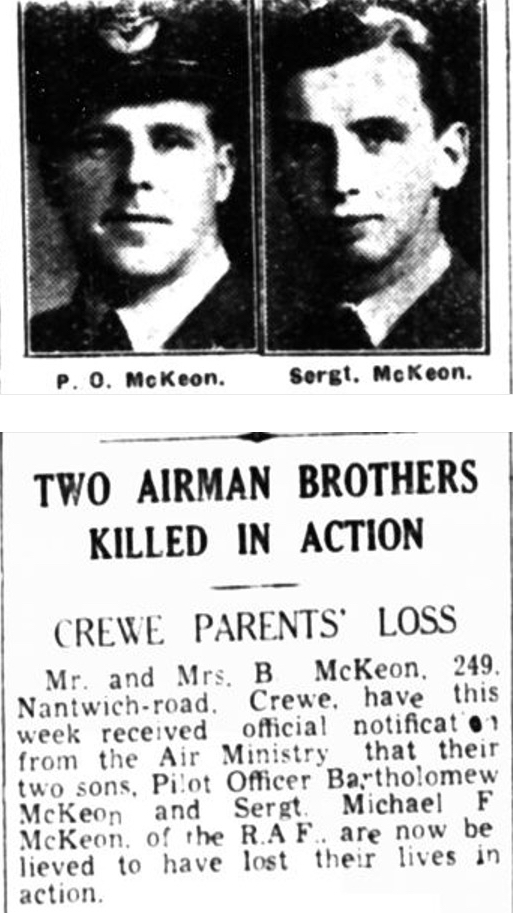 Bartholomew’s younger brother Michael Finbar McKeon who also served with the RAF was killed when his aircraft was shot down during a mission in Tunisia