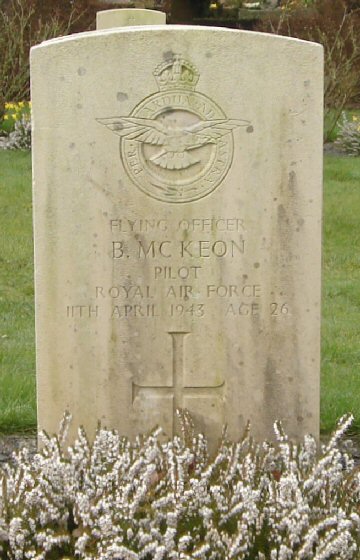 On the night of 10/11 April 1943 Bartholomew was assigned to aircraft AA417 with his gunner Flying Officer Eric Ferguson. Along with other 515 Squadron aircraft they were assigned to jam the radar located near Den Helder in Holland. As they were circling around 35 miles West of Den Helder, they were intercepted by a BF110 night fighter flown by Georg Kraft of 12/NJG1 and shot down. Their aircraft caught fire and landed in the sea. McKeon and Ferguson were listed as missing initially but in June 1943 their bodies were washed up on the shores of Denmark. Ferguson being found on 14th June and McKeon on 16th June. Both men were buried at Lemvig Cemetery in Denmark.