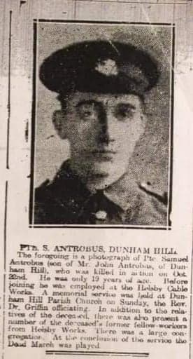 58260, 16th Bn., Cheshire Regiment who died on 22 October 1917 Age 19. Son of John Antrobus, of Oldfield Cottages, Dunham Hill,