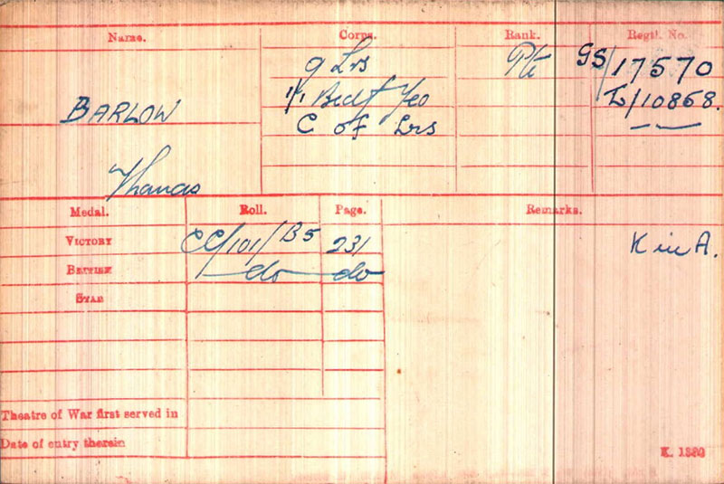 Thomas Barlow was born in 1894 in Whitehouse Farm, Shocklach, the only son and the youngest of four children, to parents Thomas Barlow senior and Ann. Ann died aged 37 when Thomas junior was 9. His father was a horse dealer and so when Thomas enlisted in the army in 1916 he joined the cavalry, with the 9th Lancers, and later with the 1/1st Bedfordshire Yeomanry.