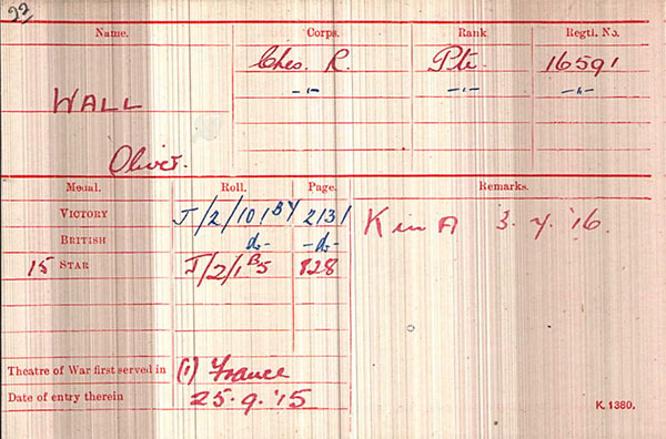 Gunner Walls elder brother, Private Oliver Wall, of 11 School Place, who was reported missing since July 2nd, is 34 years of age, and joined Kitchener’s army on its formation in the early days of the war. He has a wife and four children. Mr and Mrs Wall have another son who was also serving but is now lying ill in hospital.