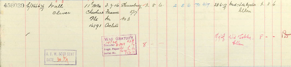 Mr and Mrs Wall of 44, Frederick Street, have received official intimation of the death of one son and that another is missing. They are Gunner Benjamin Wall of the Australian Imperial Force (killed), and Private Oliver Wall, of the Cheshire Regiment (missing)
