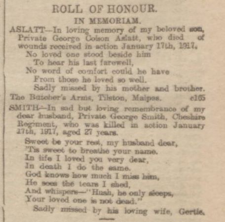 18/01/1917 Private Harry Grace (Age 28) 8th Bn. Basra Memorial, Iraq. ‘35730’ Panel 14 and 62. Son of John Grace, of Saighton, Chester, and the late Emma Grace.