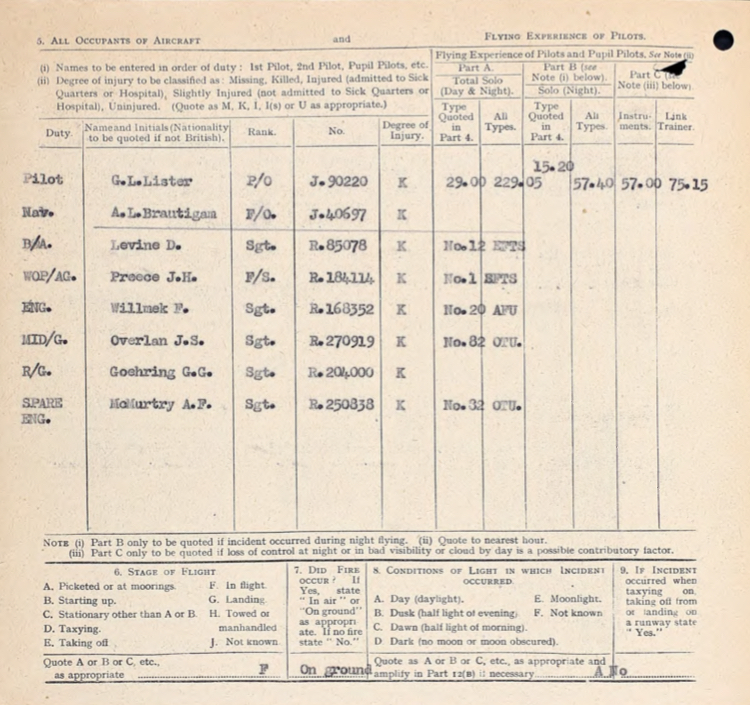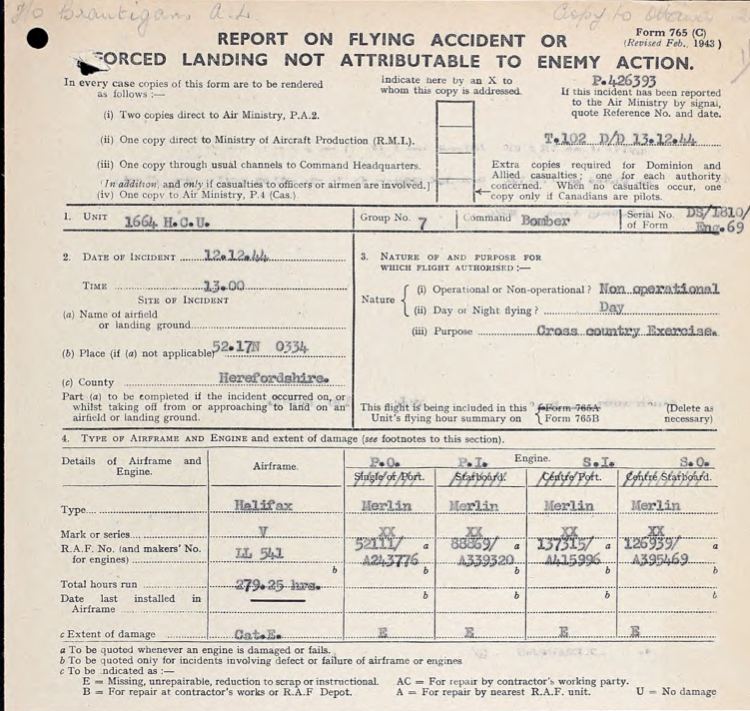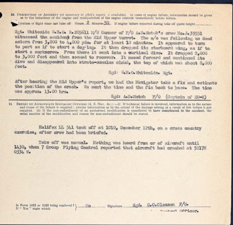 LL541 was on a daytime cross country training mission along with another Halifax and flying at 18,000 feet when it suddenly went into a near vertical dive and disappeared into clouds with the cloud tops at 8,000 feet. The aircraft was observed to come out of the clouds at 3000 feet in pieces and crashed into the ground with the death of all 8 on board.