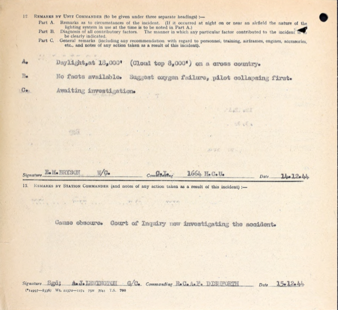 The cause of the crash was never determined but it was believed that the pilot may have passed out due to oxygen deficiency causing the aircraft to go into a dive. It is speculated that the pilot regained consciousness as the altitude decreased and tried to recover from the dive but in doing so the structural limits of the plane were exceeded and the plane broke up. One eyewitness on the ground saw the tail of the aircraft come out from the clouds at 3000 feet separated from the rest of the plane.