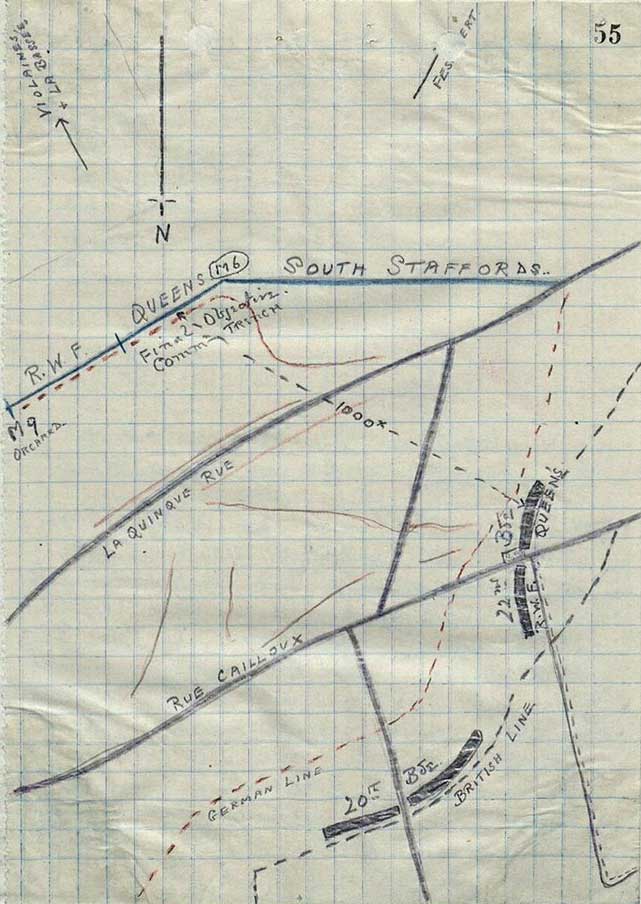 22nd Bde attacked at 03:15 on the 16th May, 2nd Queen's and 1st RWF being the assaulting battalions. Fired upon heavily right from the start they took the German front line some 75-150m away and consolidated it, then pressed on to a position about a kilometre ahead called the North Breastwork. The Queen's reached it about 06:00, and the Royal Welch about 50 minutes later but by 09:00 the attack had stalled, in large part to the heavy casualties incurred. Young Herbert was one of them. The war diary for 16th reads: During the night 15th/16th there were serval showers of rain. At 2:45am the bombardment of the enemy trenches and wire commenced and continued till 3:15am. At 3:15am the leading platoons of A coy. rushed the German trenches to their front. It was now just about daylight. As soon as our men showed their heads above the parapet the enemy opened intense rifle fire and seemed in no way affected by the artillery bombardment. The remaining two platoons of A Coy. followed the first line at an interval of 50 yards and B Coy. did likewise but when the first line of C Coy. had gone the enemy fire seemed as hot as ever. Our artillery was asked to open again on the enemy trenches, the second bombardment took affect and lasted quater of an hour and then the remaining half of C Coy. and all of D Coy. were able to get along and force the enemy to leave his trenches. The majority of casualties amongst officers and men occured between our own lines and those of the enemy. The remaining officers and men about 230 advanced beyond the captured German line towards their final objective as shown on the sketch. The 800 yards was covered quickly with very little oppostion. Two more so called German lines were passed and also La Quinque Rue. There were many Germans dead in them. The final objective, the German trench at M6 was reached about 6am where we connected up with the Staffords on our right and part of the Warwicks and RWF on the left. Throughout the day the enemy heavily shelled the orginal British line and the captured German first line, at about 3:30pm we ourselves were subject to H.E shell fire from both flanks, many men were wounded because the posostion became untenable. The remains of the Queens, Welsh Fusiliers and Warwicks withdrew at about 7:30pm and occupied the first line of the German trenches captured in the early morning.