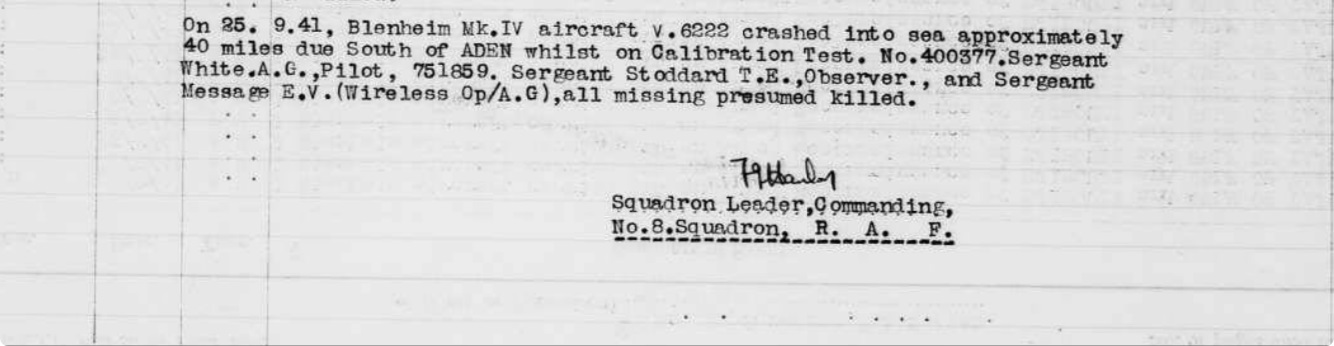 Thomas was an Air Gunner with 8th Squadron RAF flying Blenheim IV aircraft out of Aden. On 25th September 1941 his aircaft was carrying out calibration exercises off Aden when it crashed into the sea with the loss of all three crew members on board.
