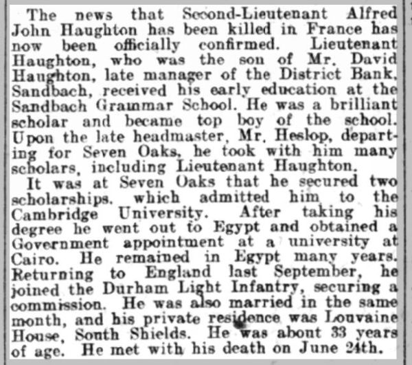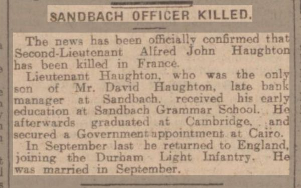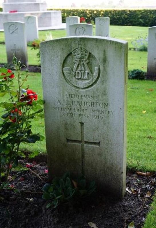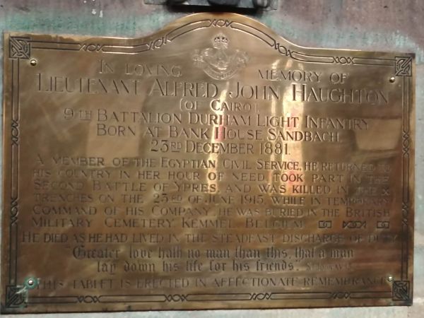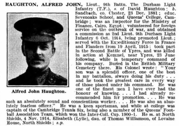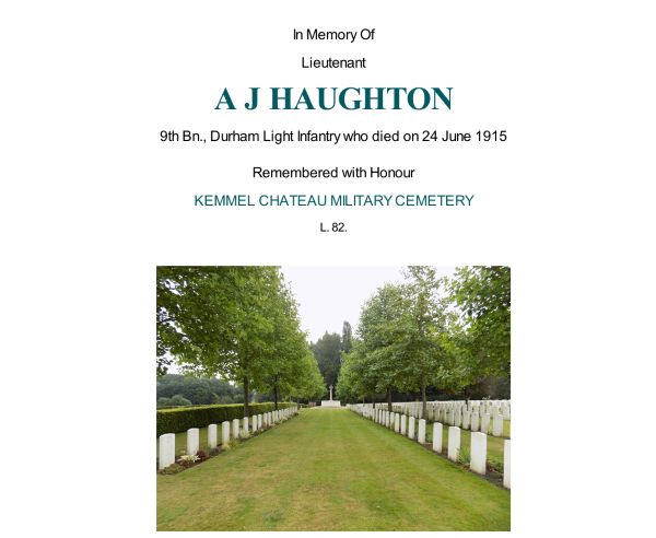 IN LOVING MEMORY OF LIEUTENANT ALFRED JOHN HAUGHTON (of Cairo) 9TH BATTALION DURHAM LIGHT INFANTRY