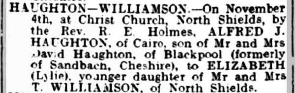 A month later, on the 4th November 1914, Alfred (32) married 24-year-old Elizabeth (Lylie) Williamson, in Christ Church, South Shields. By this time, his parents had moved away from Sandbach to Blackpool.