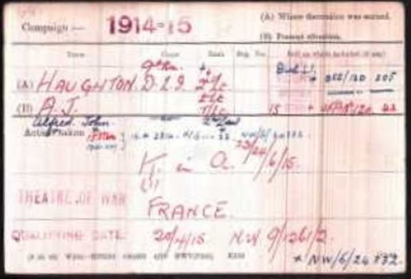 Alfred John Haughton was born in Sandbach on 23rd December 1881, the only son of bank manager David Haughton (1841 - 1921) and his wife Emily Lees Rowley (1856–1940). Alfred had two sisters Ethel Annie (1879–1931) and Marian (1883–1948). The family home was at Bank House, Hightown, Sandbach, next door to the Wheatsheaf pub.