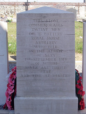 The Action at Néry In the aftermath of the Battle of Mons, which took place on 23 August 1914, the British forces, along with their French allies, began retreating south west toward Paris. By the evening of 31 August, most British units had crossed the Aisne between Soissons and Compiègne and halted for the night on the south banks of the river. The men of the 1st Cavalry Brigade bivouacked in and around the village of Néry with orders to begin moving again at first light. The Brigade numbered almost 2,000 men and consisted of three cavalry regiments which were supported by L Battery of the Royal Horse Artillery. The cavalry were stationed in Néry while L Battery was billeted in a sugar factory just south of the village. A heavy mist hung in the valley and visibility was poor as the sun rose on 1 September. The Brigade had awoken at 4.30 but a decision was made to delay departure for an hour and a half until the weather cleared. As they waited, officers and men busied themselves watering the horses and preparing breakfast. At approximately 5.30 a.m. a unit of the 11th Hussars which had been patrolling the woods outside Néry dashed into the village and reported that they had sighted a large enemy force. Just minutes after the patrol arrived on the scene, the Brigade came under heavy shell, machine-gun and rifle fire from the heights overlooking the village to the east. The attack caught the Brigade almost completely by surprise and the effect of intense fire from above the village was devastating. The horses of L Battery bolted and several gunners were killed or wounded as they tried to take cover. Despite the chaos caused by the attack, Captain Edward Bradbury immediately began issuing orders and managed to get three of the battery’s six guns moved into firing positions. Two of these were soon put out of action by German shell fire, but Bradbury, along with Sergeant David Nelson and two gunners, manned a third gun and kept up a steady rate of fire against the German lines. The gun continued firing for over two hours, and successfully drew German artillery fire away from the British cavalry. The Brigade was able to hold its position and engage the attackers until reinforcements from III Corps arrived and forced the German units on the heights to retreat. The German force that launched the attack at Néry amounted to over 5,000 men of the 4th Cavalry Division and thus outnumbered the 1st Cavalry Brigade by more than two to one. L Battery was almost completely destroyed during the fighting, but casualties in the rest of the brigade were relatively light. Captain Bradbury was fatally wounded while fetching ammunition and posthumously awarded the Victoria Cross. Sergeant-Major George Dorrell and Sergeant Nelson both survived the fighting and were awarded Victoria Crosses. The Commander-in-Chief of the BEF, Sir John French, formally mentioned the Brigade in dispatches on 14 September.