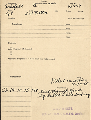 Albert attested in Montreal, Quebec 29th October 1914, his given age was 21 years, he was 5ft 10 ¾ inches tall, with brown eyes and brown hair, he gave his trade as a carpenter. He was promoted to corporal 30th March 1915 at Shorncliffe. He was transferred to the 3rd battalion Canadian Infantry 3rd May 1915 in France. Albert was killed in action near to Ploegsteert Wood 7th October 1915, part of his record below shows he was shot through the head while he was sniping.