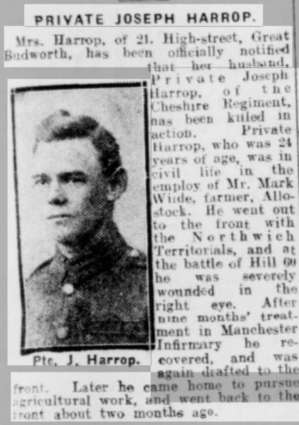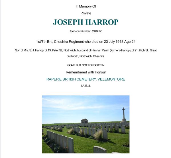 Joseph Harrop was married to Hannah, and had lived at 21 High Street, Great Budworth.