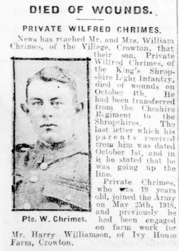 Born on 28 April 1899 at Crowton, son of railway labourer, William and Elizabeth, (nee, Partington), Chrimes, of, Bent Lane, Crowton, Cheshire.