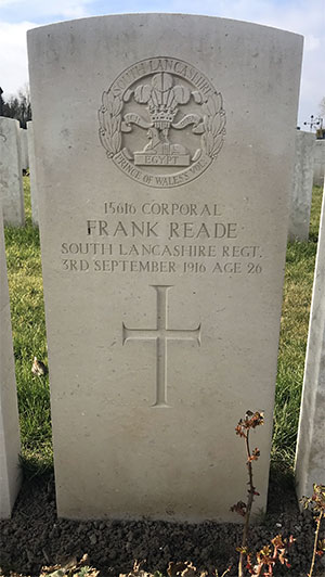 Official intimation has been received that Corporal F. Reade, of the South Lancashire Regiment, has died of wounds received in action. Before joining the army, he was a labourer in Crewe Works. He formerly lodged in Minshull New Road, Crewe.
