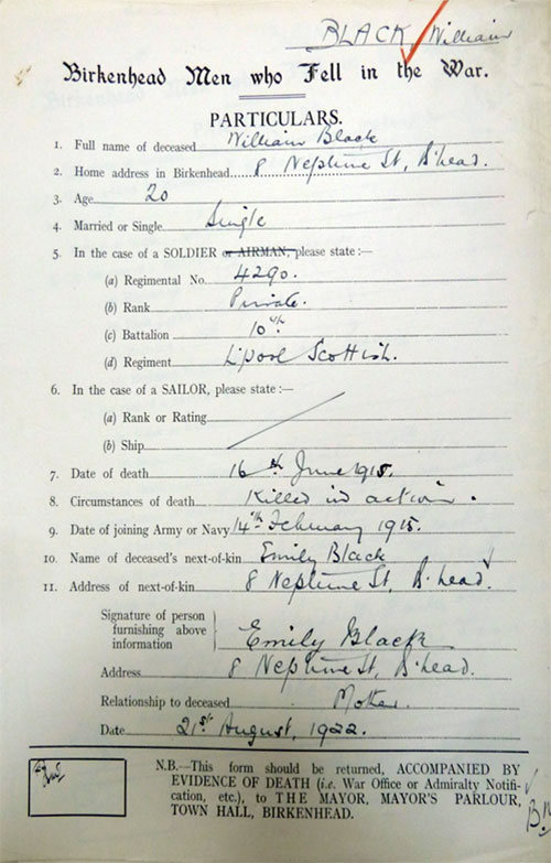William Black was born in Birkenhead, in 1895, the son of John Charles Black. His father was born in Birkenhead, in1864, and later married. He had 2 sons: John James Black (born in 1893), and William Black. Between 1895 – 1905, John Charles Black’s wife died, and in 1905, he re-married to Emily Ann Smith, who had 6 children of her own: Alfred Smith (born in 1891); Annie Smith (born in 1889); Ernest Smith (born in 1892); Samuel Smith (born in 1894); Sydney Smith (born in 1899); and Emily Smith (born in 1902); and the couple had 2 daughters together: Edith Black (born in 1906), and Florence Black (born in 1908). In 1911, they were living at 42, Neptune Street, Birkenhead, and John Charles Black was employed as an Engineer Fitter. John James Black was a General Labourer; William was a Railway Goods Checker with the London & Norh Western Railway Company; Edith was still at school; Alfred Smith was a Carter; Annie was a Soap Packer at Messrs. Lever Brothers, Port Sunlight; Ernest Smith was a Railway Porter; and Sydney and Emily Smith were still at school. William Black later became a Junior Goods Porter. In his spare time, he was a member of the St. Nathanael’s Boy’s Club, and the church football club.