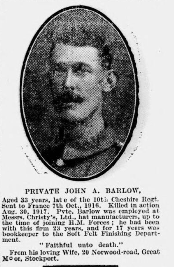 John was the son of John Henry Barlow, a hatter , of 12 Elizabeth Street, Stockport. He had been educated at St Thomas’ Day School and then also went to work in the local hatting industry. He had worked for Christy Ltd and was the book-keeper in the Soft Felt Finishing Department. He was married and lived with his wife at 20 Norwood Road, Great Moor until he enlisted into the army in the late spring of 1916. After training, he went overseas on 2 October 1916. On 30 August 1917, the Battalion moved from reserve positions near Steenvoorde (to the west of the Belgian town of Ypres), just over the border into France. They relieved front line troops to the east of Ypres (now Ieper) and positions known as “Leinster Street” and “Menin Road Tunnel”. The latter is thought to refer to a large culvert running under the road. John was one of five soldiers who were killed, most probably be shellfire, during the relief.