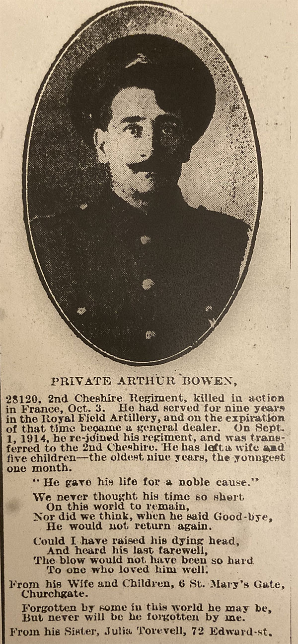 Arthur is believed to have been born in Halifax but, by the time of the 1901 Census, was living in Stockport where he worked as a showman. Family information suggests that he was a bareback horse rider in a circus. Arthur was married to Alice and they lived at 6 St Mary's Gate, Stockport. They had five children. The oldest was 9 and the youngest only one month. Arthur probably never saw his youngest child. He carried on trade as a general dealer. Arthur had been a regular soldier for 8 or 9 years, serving with the Royal Field Artillery. He was still a reservist and was mobilised when war was declared in August 1914. He served again with the RFA, (service number 36924), but this is probably only until December 1914 when the Cheshires returned from India. He was killed at the Battle of Loos. After the war, Alice Bowen was living at 4 Barke's Buildings, Churchgate, Stockport.