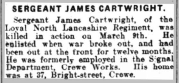 | Killed In Action | Friday 9th March 1917 |