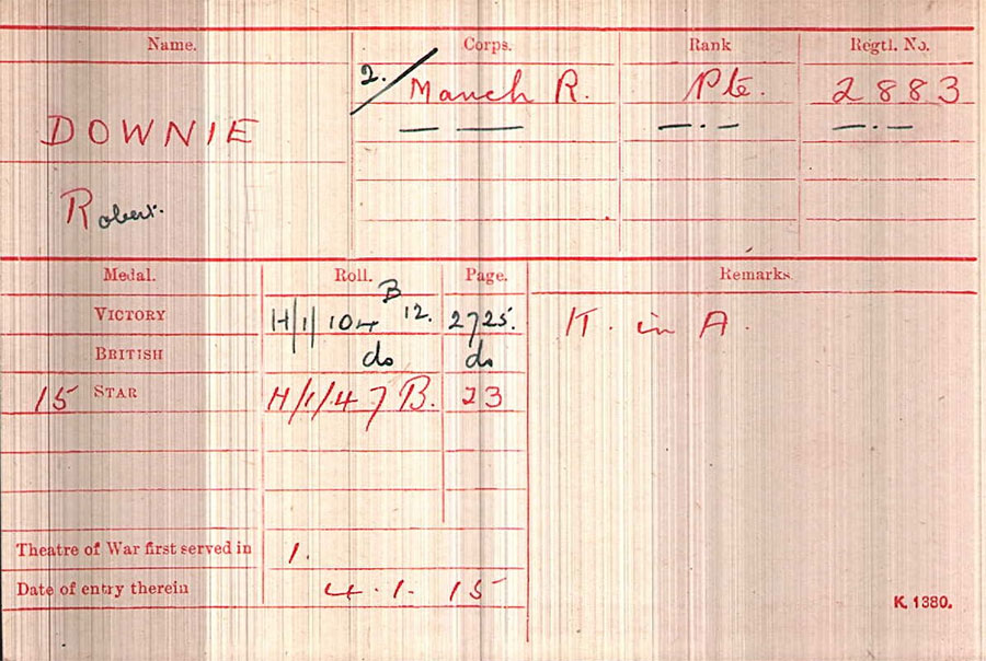 Sergt. Morris (5th Cheshire’s), the verger at St. Mary’s-on-the-Hill (who is home on leave this week), told Miss Cecilia Keith Douglas that Downie was also a great favourite with his fellow soldiers. He often saw Sergt. Morris who was talking to him about ten days ago just before the Manchester’s returned to the trenches, where Downie met a soldier’s fate. He was shot through the heart, and his chum who wrote the sad news home, saw him buried next day. His father was in the Black Watch and fell in the Boer War. He came to the working boy’s home as a little boy and was one of the best young fellows ever turned out from the home.