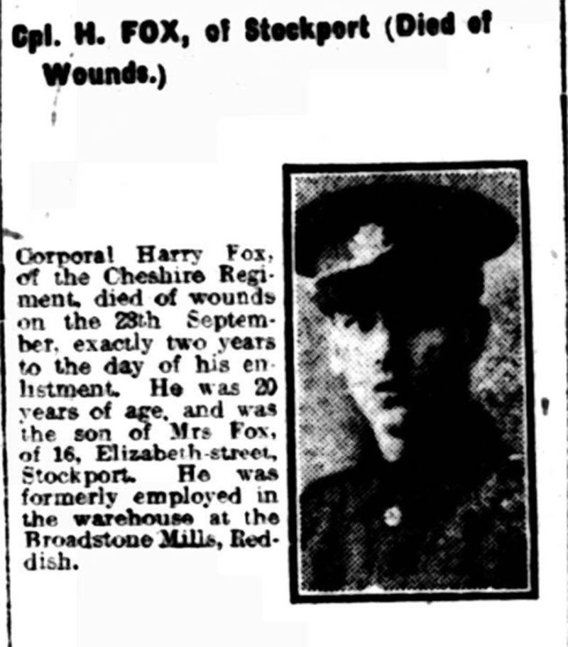 Harry's family home was at 16 Elizabeth Street, Stockport, where his mother lived. In 1916, he had three brothers also serving in the army. Only one, George, is known to have been fighting in Salonika in Greece. Harry worked in the warehouse at Broadstone Mills, Reddish and was engaged to be married to Mary. He enlisted into the local Territorial battalion in the autumn of 1914 and went to France 18 February 1915. On 26 September 1916, as support for a major attack on the Thiepval Ridge (in the heart of the Somme battlefield), the Cheshires were ordered to conduct a raid on the enemy trench opposite their position at Beaumont-Hamel. The Regimental History records that "Under cover of a barrage, they crossed no man's land at 9pm and rushed the enemy trenches. A fierce fight ensued. While the covering party on the enemy parapet kept the enemy at bay in face of heavy machine gun fire, another party attempted to clear the enemy trenches. The trenches were found to be blocked with "knife rests" and loose wire. All the German garrison were killed or driven off and our men withdrew with some difficulty with a loss of 12 men.” Harry’s platoon officer wrote to the family saying that he had been killed by a machine gun bullet. "You have lost a brave son. God alone can comfort you for that and we have lost a plucky soldier and true friend."